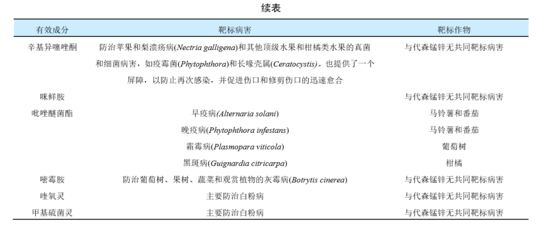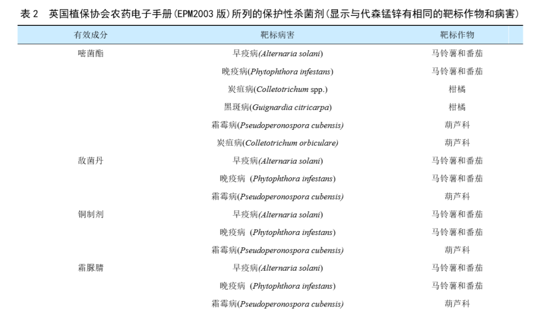 表2 英国植保协会农药电子手册(EPM 2003版)所列的保护性杀菌剂(显示与代森锰锌有相同的靶标作物和病害)