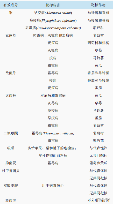 二是根据代森锰锌重要的靶标作物-病害组合,寻找目前已经被推荐用于这些作物-病害组合的其他杀菌剂有效成分,作为代森锰锌可能的备选替代物。