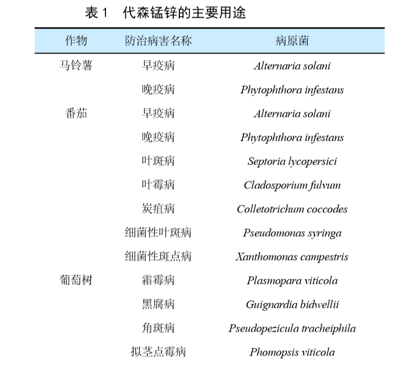 代森锰锌以叶面喷施使用为主。除此而外,代森锰锌还可用于种子处理和某些植物营养繁殖材料的浸蘸处理。代森锰锌在小宗作物病害防治中也有重要用途。现将代森锰锌的主要用途列于表1中。