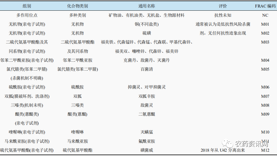 表3 杀菌剂抗性行动委员会(FRAC)2020年杀菌剂作用方式表中的多作用位点杀菌剂有效成分