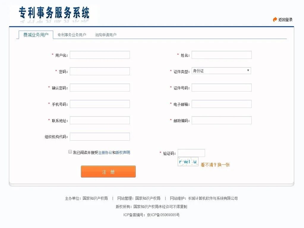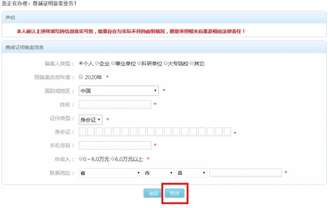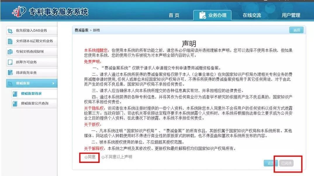 1.提交费减备案请求,需通过专利事务服务系统办理,登录地址为:http://cpservice.sipo.gov.cn/。中国专利电子申请网注册用户可直接使用注册用户名及密码登录;非电子申请注册用户需注册费减业务用户登录。2.登录后进入业务系统首页,点击“菜单栏”的“业务办理”,选择左侧“日常功能”栏中的“费减备案请求”后,点击最右侧“业务办理”。3.进入声明页面,选择“同意”,点击“已阅读”按钮,进入新增费减备案申请页面。4.根据实际情况填写信息,有红色星号*的为必填项,填写完成后点击“预览”按钮,进入预览页面。点击“附件信息”处的“上传文件”,在弹出的对话框中选择“文件类型”,点击“请选择文件”,在弹出的对话框中添加相应的图片文件。