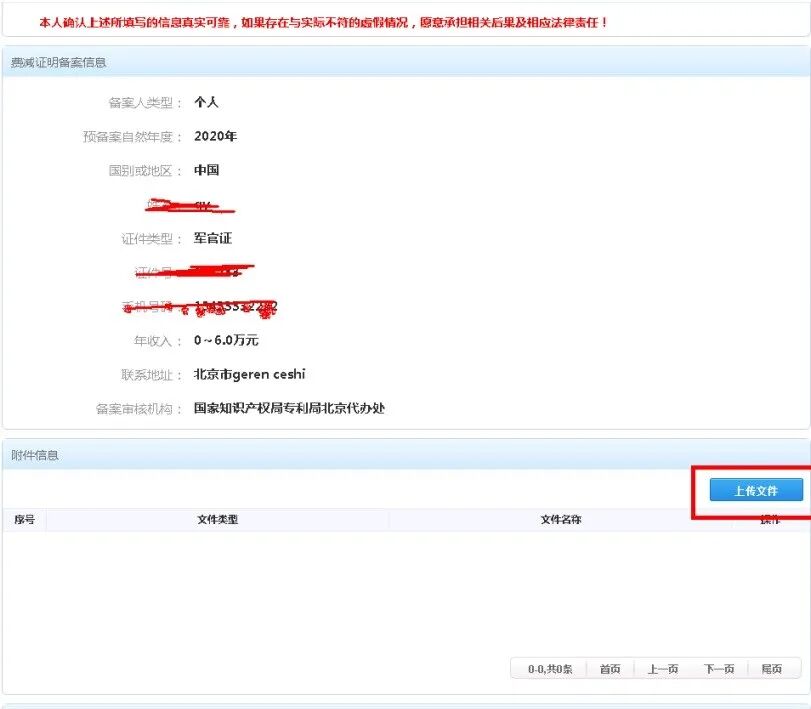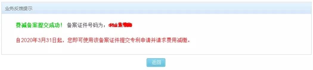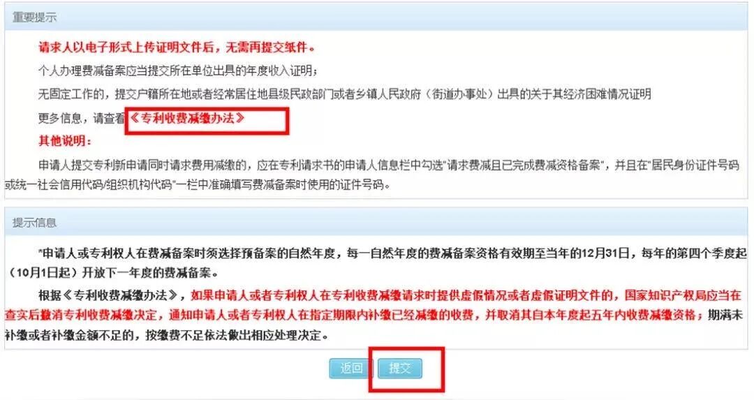 6.页面展示出费减备案享受的权利以及重要提示,此页信息提交成功后可以在查看页面打印,点击“提交”。7.确认提交后会展示系统回执,费减备案请求提交成功。注意:成功上传电子证明材料并提交费减备案请求成功后,无需再向审核机构提交纸质证明材料。