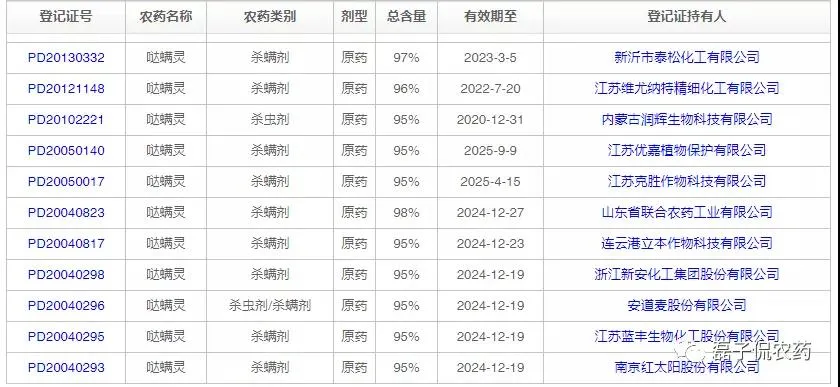 截至2020年6月,我国共有哒螨灵原药登记11个。