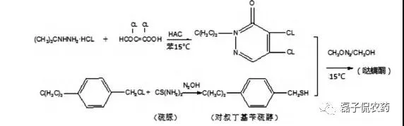 由特丁基肼盐酸盐与糠氯酸缩合制得二氯哒嗪酮;由对特丁基卞氯与硫脲反应制得对叔丁基苄硫醇,再由二氯哒嗪酮与对叔丁基苄硫醇缩合制得哒嗪酮。