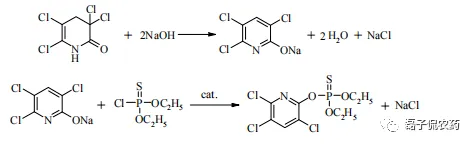 毒死蜱是通过 3,5,6-三氯吡啶-2-醇钠(简称三氯吡啶醇钠)和 O,O-二乙基硫代磷酰氯,在催化剂如4-二甲氨基吡啶(DMAP)、三乙基苄基氯化物(TEBAC)、聚乙二醇(PEG)或三乙胺(TMA)等作用下发生亲核取代制备的。根据反应的溶剂不同,目前合成毒死蜱的方法主要分为双溶剂法和水相法。