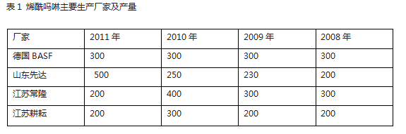 烯酰吗啉在国内的首个登记是2002年山东先达化 工(集团)有限公司。当时烯酰吗啉市场量很小,属于防治霜霉病、疫病的最新药剂。紧接着国内有8~10家企业生产该产品,国内市场迅速得到开发,使用量大幅度上升,现在已经是霜霉病、疫病的最大使用药剂。目前生产烯酰吗啉的主要有山东先达化工(集团)有限公司、江苏常隆化工有限公司、江苏耕耘化学有限公司,产量见表1。