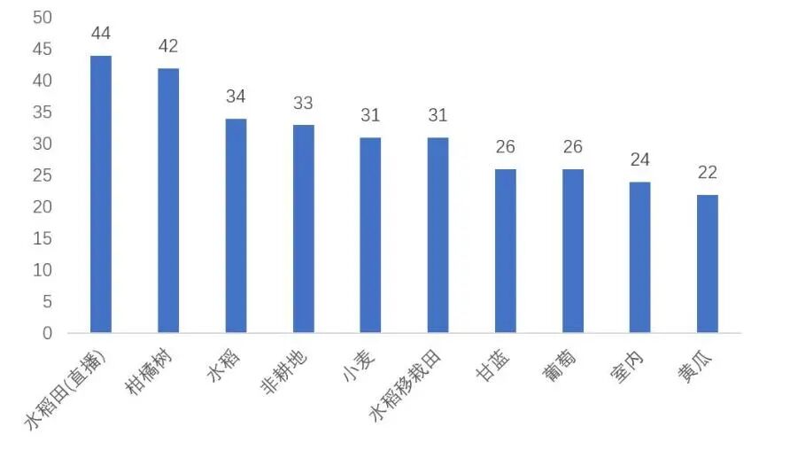 2020年上半年农药登记作物有70多种,主要集中在水稻、柑橘树、小麦等。