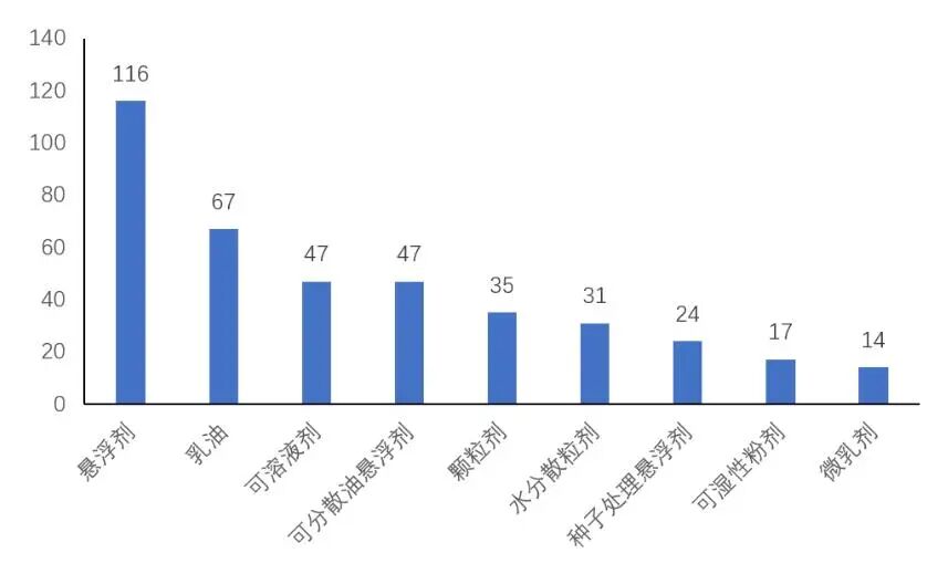 获登最多的农药类别为除草剂(172项)、杀菌剂(113项)、杀虫剂(96项)、植物生长调节剂(33项)。共34种剂型获得登记,其中,获登最多的五种剂型为悬浮剂(116)、乳油(67项)、可溶液剂(47项)、可分散油悬浮剂(47项)、颗粒剂(35项)。悬浮剂在所有登记剂型中依旧占据绝对优势。单剂中,噻虫胺(10项)、噻虫嗪(8项)和噁唑酰草胺(8项)为获登最多的农药产品。混剂中获登最多的为氰氟草酯和噁唑酰草胺的复配(9项)、乙螨唑和联苯肼的复配(5项)以及乙羧氟草醚和草铵膦的复配产品(5项)。