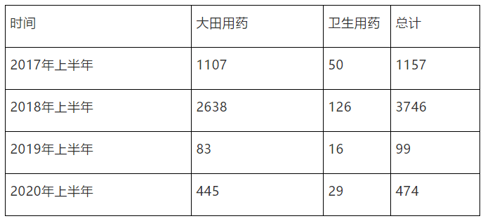 2020年上半年(2020.1.1-2020.6.30)国内新增农药登记474项,其中大田用药445项,卫生用药29项。登记总量同比2019年增加378%,与2017年和2018年相比,分别减少了59%、87.34%。继2019年农药登记数量急剧下滑之后,2020年上半年农药登记数量明显回升,但相比于2017年和2018年仍然有非常大的差距。