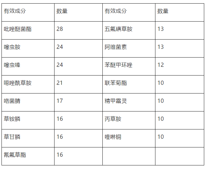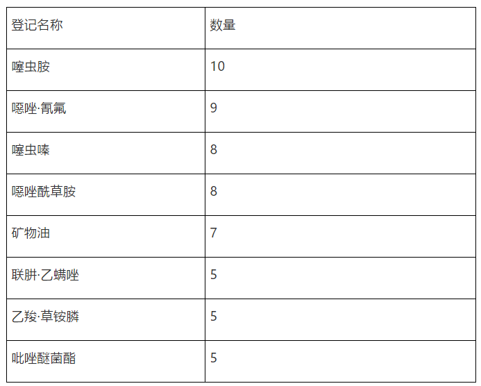 在205种有效成分中,获得登记数量最多的五种有效成分依次为吡唑醚菌酯(28项)、噻虫胺(24项)、噻虫嗪(24项)和噁唑酰草胺(21项)。