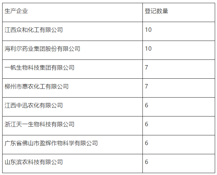 2020年上半年有240家企业获得了农药登记证,其中江西众和化工有限公司和海利尔药业集团股份有限公司各获得10项农药登记证,为获得登记证数量最多的企业。