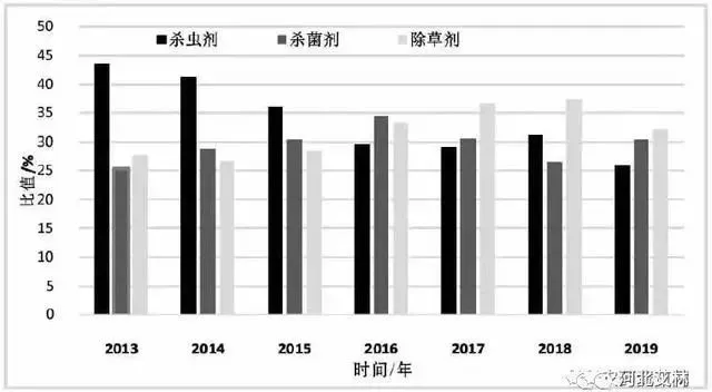 2016年起,杀虫剂(包括卫生用农药)登记数量与本年度新增农药登记数量的比值改变了原来处于领先地位的局面,并逐年降低。2017年起除草剂的比值稳居第一(7年的年均增长率为2.55%),其余二者紧跟其后(图7)。