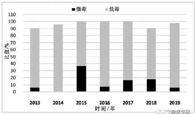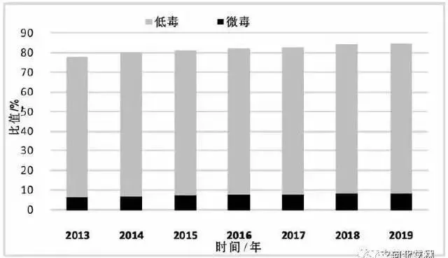 从农药毒性级别看,近年登记的农药产品结构在悄然改变,每年微毒/低毒农药登记数量与当年农药登记总量的比值在稳步上升,从2013年的78.3%上升到2019年的84.6%,年均增长率为1.30%(图3),相应每年的中等毒、高毒和剧毒农药登记数量与当年农药登记总量的比值在逐渐下降。