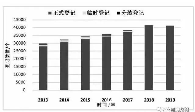 2019年度与2018年度新登记数量同比减少了93.5%(图2),主要与实施《条例》和配套规章提高登记门槛有关,还可能受环保、安全生产及农药生产许可证的颁发等政策限制,造成农药企业转行、兼并重组等,影响了企业产品登记。