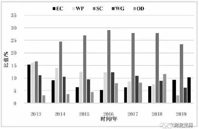 图5 各主要剂型登记数量与当年产品登记总量比值