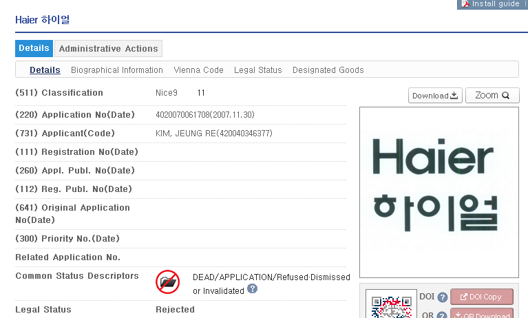 l “海尔”电器的商标(第9,11,35类等多个类别)在韩国被抢注(抢注商标现已失效)。