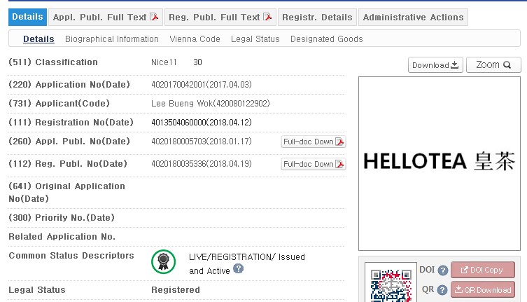 l “HELLOTEA皇茶”(第30类)饮品商标在韩国被抢注(抢注商标仍然注册)