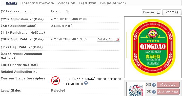 l 青岛啤酒的商标(第32类)在韩国被抢注(抢注商标现已失效)。