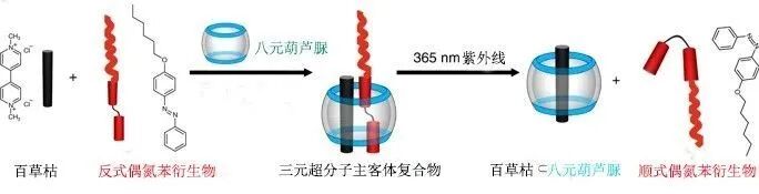 Gao等采用两亲性超分子主客体复合物自组装的手段,研制了一种负载百草枯农药分子的太阳光响应型超分子纳米囊制剂,极大地降低了该制剂对生物体的毒性,而且保持了良好的除草性能。八元葫芦脲、偶氮苯衍生物和百草枯分子三者形成三元超分子主-客体复合物,八元葫芦脲和偶氮苯衍生物的烷基链分别作为亲水端和疏水端,在水溶液中自动组装为纳米囊,对百草枯分子进行包裹(图1)。