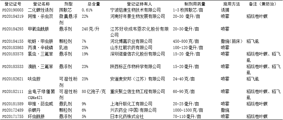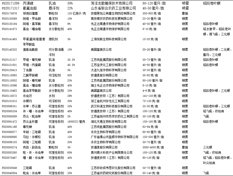 我国北方水稻插秧期(约5月20-25日)即将到来。截至2020年4月30日农药登记公告,在我国取得登记用于防治水稻二化螟并在有效期内的部分农药产品信息整理如下,供北方单季稻区农药销售商和水稻种植家庭农场参考选用。