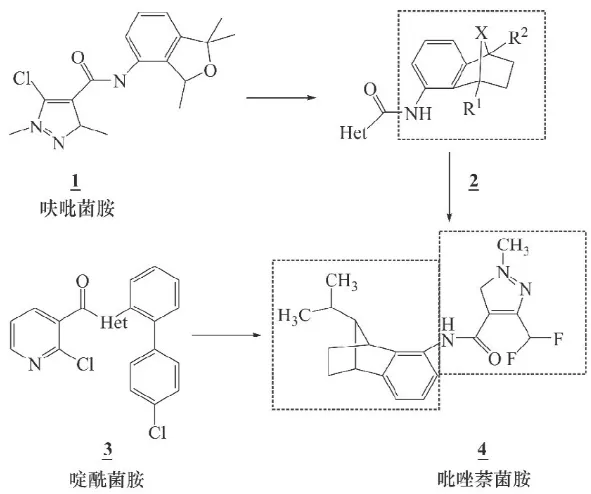 “呋吡菌胺 (1) 用途较窄 (水稻纹枯病) , 但理化性质, 水溶性, 内吸传导性较好。我们首先选择了呋吡菌胺作为分子优化的开始。”“类似呋吡菌胺 (1) 的分子结构由于双环结构的9位上杂原子X的存在 (2) , 该活性成分对小麦壳针孢叶枯病菌的杀菌作用很低, 且总体的杀菌效果较低, 通过引入氨基苯并降冰片烯代替9位的杂原子X, 分子的活性明显, 且达到广谱效果的目标。”“通过9位的苯并降冰片烯的异丙基团和吡唑萘菌胺 (4) 中的3-二氟甲基-1-甲基-4-羧酸的共同作用可以达到防止锈病和小麦壳针孢叶枯病菌的良好效果。”