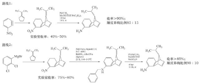以SDHIs杀菌剂为例, 截至目前已经开发9个吡唑酰胺类杀菌剂, 此类吡唑酰胺类杀菌剂均需要1个共同的关键中间体3-二氟甲基-1-甲基-吡唑-4-甲酸, 目前中国、印度和日本已经取得合成工艺的突破, 吡唑酰胺类SDHIs杀菌剂也会随着合成原料的不断优化, 生产和销售成本不断降低, 为SDHIs杀菌剂的市场推广带来助力。吡唑萘菌胺的合成路线筛选也充分体现了这点 (如图4) , 先正达对合成路线进行了筛选:硝基苯路线1的加氢反应用钯碳催化剂代替了价格昂贵的铑, 通过控制加氢条件, 顺反异构比例控制在85:15, 实验人员继续优化工艺, 采用路线2, 可以提高收率、减少副产物和固体残渣。