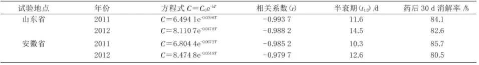 试验结果 (表3) 表明, 山东试验的抑芽丹在土壤中的半衰期为11.6~14.5 d, 药后30 d消解率达82%以上;安徽试验的抑芽丹在土壤中的半衰期为10.3~12.6 d, 药后30 d消解率达80%以上。