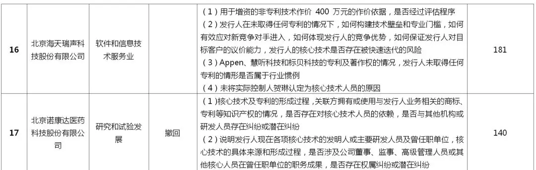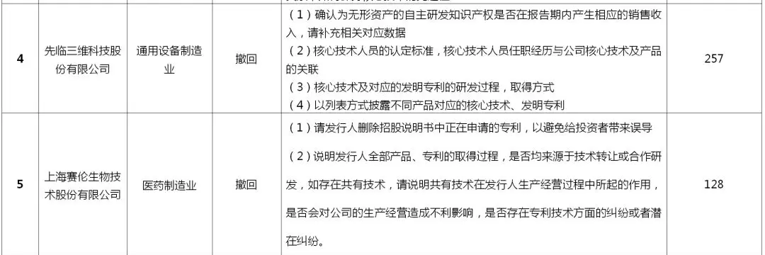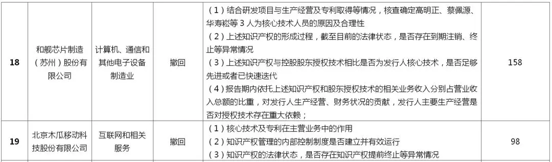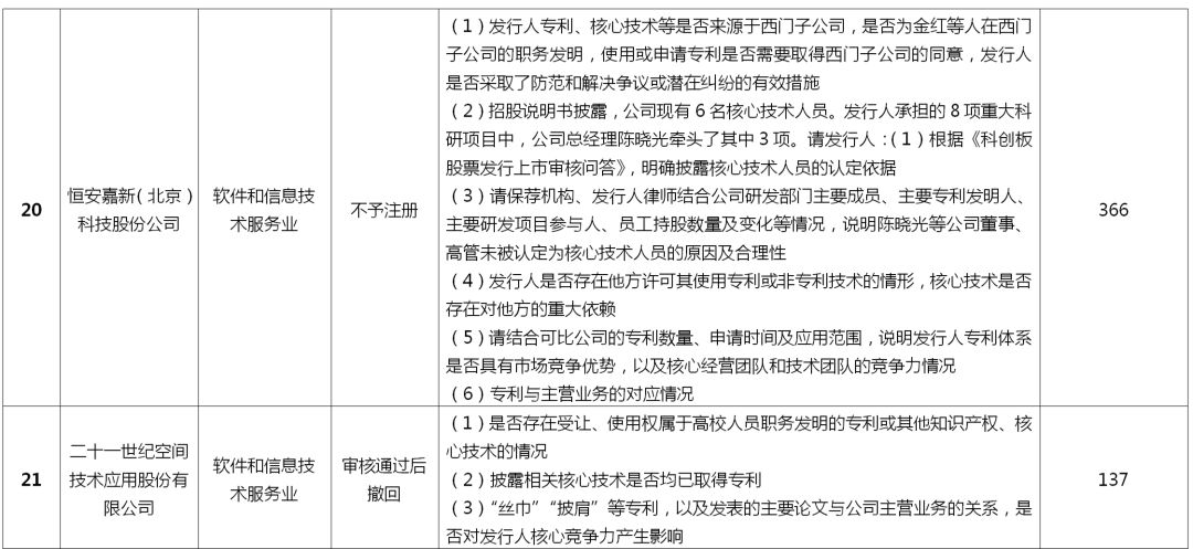 本文重点关注了19家审核终止公司和3家注册失败公司在上交所审核期间被问询的有关知识产权方面的问题(详见表2),并试图从中归纳总结出科创板上市在知识产权方面的关注重点。