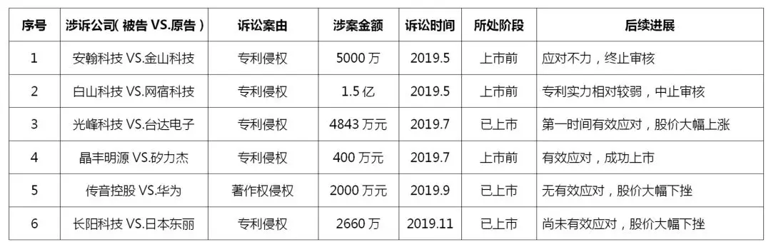 事实上,科创板已经成为知识产权诉讼的高发地。今年5月份以来针对科创板公司发生的知识产权诉讼已经有6起,详见表1。诉讼时间既有在上市前期也有已经成功上市的,诉讼金额多数在千万以上甚至过亿。从后续进展来看,如果不能及时有效应对,往往会由此引发上市受阻或股价大幅下挫等严重后果。