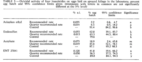 乙酰甲胺磷具有优秀的杀卵效果,据(M.A Foot, 1975)发布的4种药剂对鳞翅目害虫卵的室内测试效果来看,在使用浓度0.075%活性成分下,对卵孵化成幼虫的抑制率达81.1%。