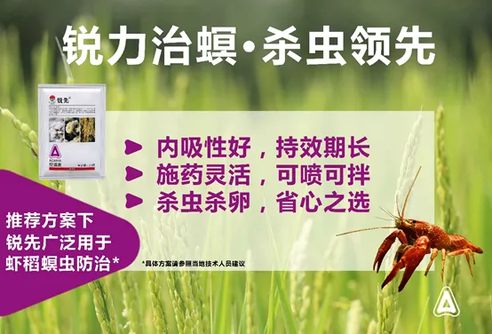 锐先 性格比高:虾稻田安全用药、广谱防治水稻害虫,一药多治。