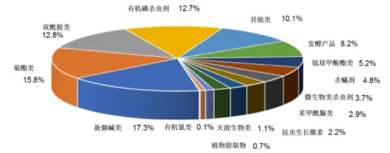 2019年,杀虫剂品种结构发生了很大的变化,烟碱类、苯甲酰脲类、酰肼类、嘧啶胺类、大环内脂类、杂环类、双酰胺类等正大量使用;拟除虫菊酯类、沙蚕毒类虽仍被关注,但正逐渐被取代;有机磷类、氨基甲酸酯类逐步萎缩,共计214个,目前只有20余个为常用品种;而有机氯类已被淘汰。
