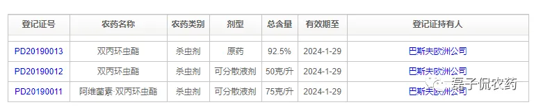 2019年1月,巴斯夫欧洲公司的双丙环虫酯原药在我国首获登记(登记有效期为2019年1月30日~2024年1月29日),含量92.5%,低毒;同时获得登记的还有其制剂产品,50克/升双丙环虫酯可分散液剂,低毒,用于防治棉花蚜虫和苹果树蚜虫,喷雾,制剂用药量分别为10~16毫升/亩、12,000~20,000倍液;75克/升阿维菌素·双丙环虫酯(50克/升双丙环虫酯+25克/升阿维菌素)可分散液剂,用于防治番茄烟粉虱、黄瓜蚜虫、辣椒烟粉虱,喷雾,制剂用药量分别为45~53毫升/亩、9~13毫升/亩、45~53毫升/亩。