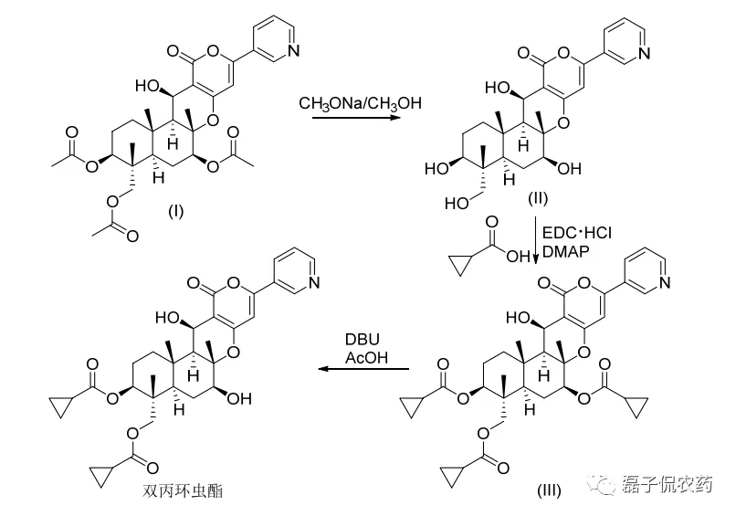 据资料显示,双丙环虫酯可由中间体(II) 1,7,11-三脱乙酰基啶南平与环丙烷甲酸在1-(3-二甲氨基丙基)-3-乙基碳二亚胺盐酸盐(EDC· HCl)和 4-(二甲氨基)吡啶(DMAP)催化作用发生酯化,再与 1,8-二氮杂双环[5.4.0]十一碳-7-烯(DBU)反应脱去 7-位的环丙甲酰基后得到,其粗产物用硅胶[Mega Bond Elut (Vari an),丙酮/正己烷=1∶1]提纯。