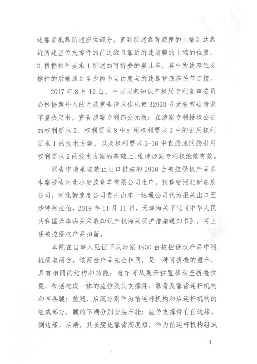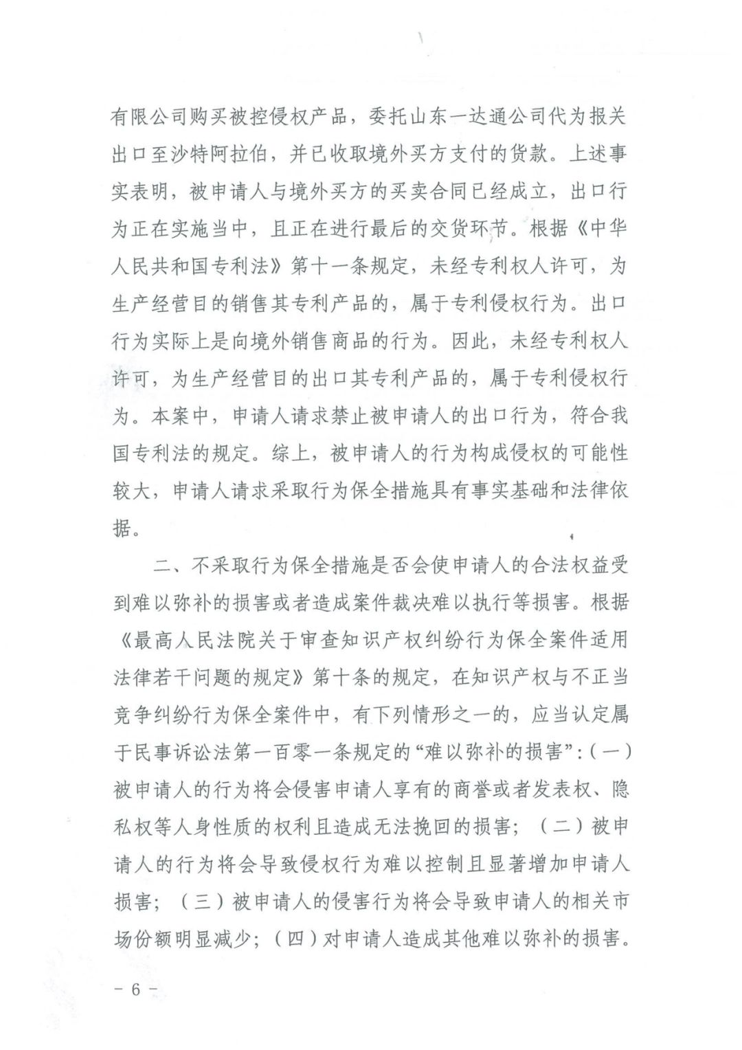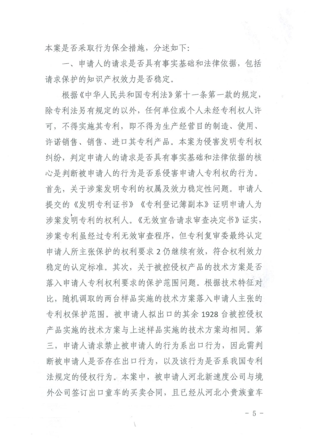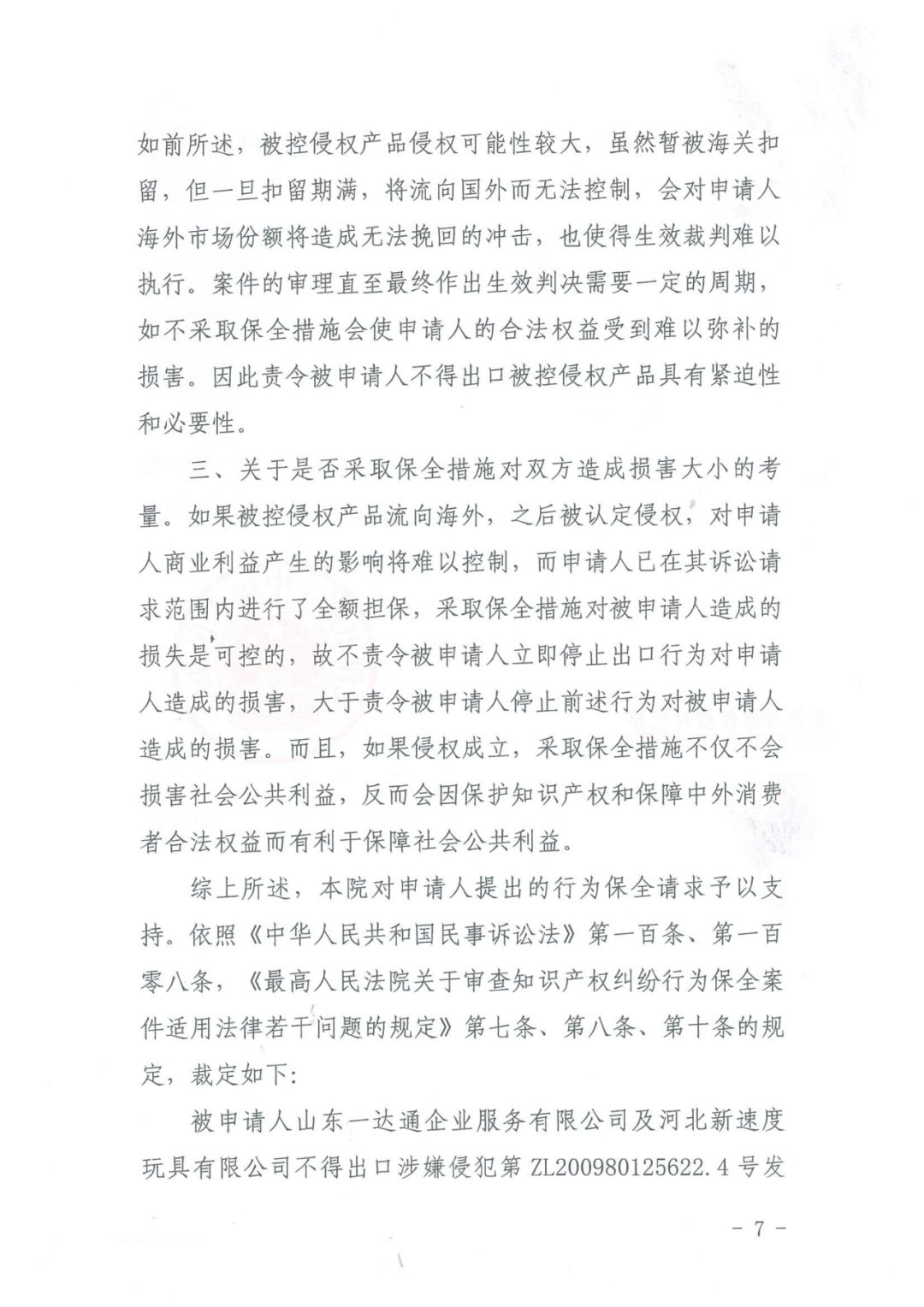 近日,天津知识产权法庭在审理贝比赞公司(BABYZEN)诉山东一达通企业服务有限公司、河北新速度玩具有限公司侵害发明专利权纠纷案件中,颁发了临时禁令,该禁令是全国首例涉发明专利纠纷案件海关临时禁令,对于知识产权海关保护极具参考意义。被控侵权产品侵权可能性较大,虽然暂被海关扣留,但一旦扣留期满,将流向国外而无法控制,会对申请人海外市场份额将造成无法挽回的冲击,也使得生效裁判难以执行。案件的审理直至最终作出生效判决需要一定的周期,如不采取保全措施会使申请人的合法权益受到难以弥补的损害。因此责令被申请人不得出口被控侵权产品具有紧迫性和必要性。关于是否采取保全措施对双方造成损害大小的考量。如果被控侵权产品流向海外,之后被认定侵权,对申请人商业利益产生的影响将难以控制,而申请人已在其诉讼请求范围内进行了全额担保,采取保全措施对被申请人造成的损失是可控的,故不责令被申请人立即停止出口行为对申请人造成的损害,大于责令被申请人停止前述行为对被申请人造成的损害。而且,如果侵权成立,采取保全措施不仅不会损害社会公共利益,反而会因保护知识产权和保障中外消费者合法权益而有利于保障社会公共利益。
