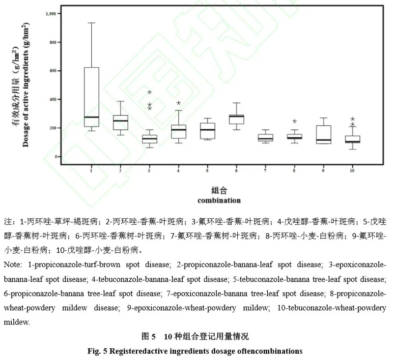 对中国农药信息网(http://www.icama.org.cn/)上登记的 21 种三唑类杀菌剂的信息进行分析,选择出单剂登记推荐有效成分用量差异大、离群高值点多的 8 种杀菌剂(三唑酮、丙环唑、三唑醇、粉唑醇、烯唑醇、戊唑醇、腈菌唑和氟环唑),分别从登记的农药剂型、作物、防治靶标等方面对其以单剂登记的推荐有效成分用量进行统计分析,从中进一步筛选出推荐有效成分用量差异大、离群高值点数较多的 3 种有效成分(戊唑醇、氟环唑和丙环唑)、 4 种登记作物(草坪、香蕉、香蕉树和小麦)和 3 种登记防治靶标(褐斑病、叶斑病和白粉病)进行组合,并对目前已登记的 10 种“有效成分-作物-靶标”组合进行数据分析。