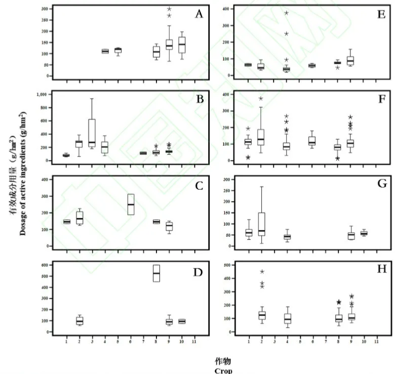 三唑酮等 8 种三唑类杀菌剂登记的作物共有39 种,为便于分析整体归为 11 个大类,分别为蔬菜、水果、草坪、林木、花卉、花生、药材、水稻、小麦、烟草和玉米(注:水果包括草莓、冬枣、梨、苹果、葡萄、青梅、石榴、西瓜、香蕉、樱桃、枇杷;林木包括茶树、柑橘树、梨树、荔枝树、枇杷树、苹果树、桃树、香蕉树、橡胶树;花卉包括观赏菊花、观赏牡丹、观赏月季;蔬菜包括菜豆、大白菜、大蒜、番茄、黄瓜、豇豆、苦瓜、辣椒、莲藕、芦笋、芹菜、洋葱、油菜;药材包括茭白、人参、三七)。推荐有效成分用量差异大、离群高值点较多的4 类作物分别为草坪、水果、林木和小麦,3 种有效成分分别为戊唑醇、氟环唑和丙环唑(图3)。不同作物上登记有效成分用量差异最大的为丙环唑(乳油和微乳剂)防治草坪褐斑病,范围为180.00~936.00 g/hm2;其次为氟环唑(悬浮剂)防治香蕉叶斑病,为 62.50~450.00g/hm2;戊唑醇在防治水果病害方面登记有效成分用量差异也较大,为46.88~375.00 g/hm2,最低为其悬浮剂防治苹果轮纹病,最高为其水乳剂防治香蕉叶斑病;其余有效成分用量差异较高的还包括丙环唑防治林木病害,为75.00~375.00 g/hm2,最低有效成分用量为其水乳剂防治苹果树褐斑病,最高有效成分用量为其乳油防治香蕉树叶斑病。
