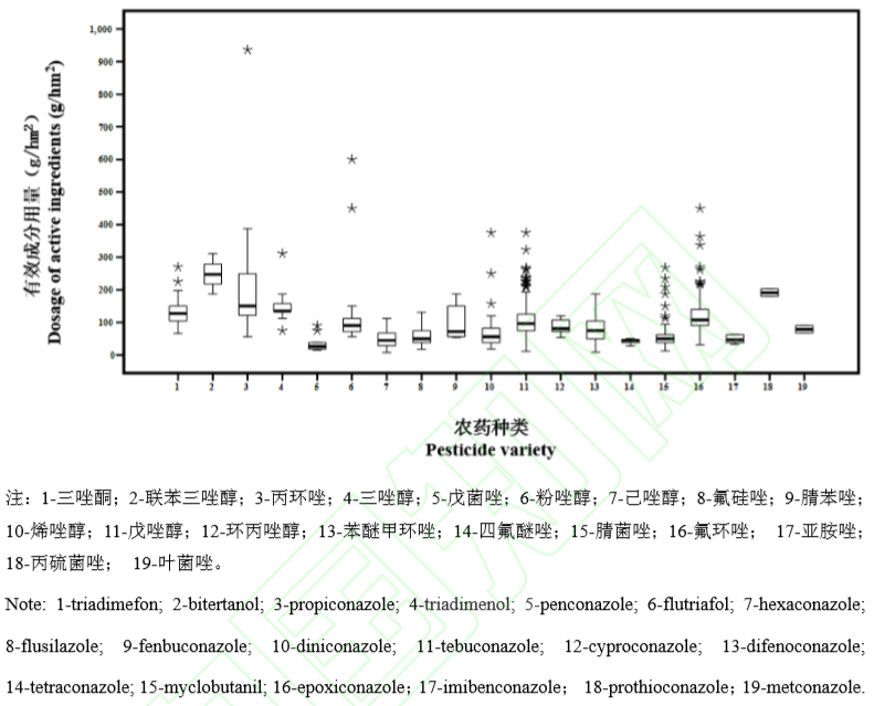 本文以三唑类杀菌剂为例,在中国农药信息网上查询其相关登记信息,并且对其推荐有效成分用量进行统计分析,意义在于分析农药登记中潜在的推荐有效成分用量差异偏大、离群高值点数较多等问题,为下一步农药的精准使用、减量使用提供数据参考。