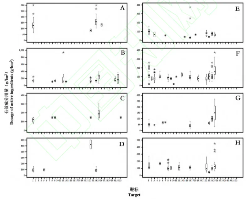 如图 4 所示,三唑酮等 8 种三唑类杀菌剂防治的病害共有33 种,推荐有效成分用量差异大、离群高值点最多的 3 种靶标分别为褐斑病、叶斑病和白粉病;推荐有效成分用量差异大、离群高值点数较多的3 个有效成分为戊唑醇、氟环唑、丙环唑(图 4)。杀菌剂对于不同靶标推荐有效成分用量范围最大的为丙环唑防治草坪褐斑病(为180.00~936.00 g/hm2);其次是氟环唑、戊唑醇防治香蕉叶斑病(分别为62.50~450.00 g/hm2和46.88~375.00 g/hm2)和丙环唑防治香蕉树叶斑病(为 187.50~375.00 g/hm2);其余有效成分用量范围较高的还有丙环唑乳油防治胡麻叶斑病(56.25~375.00g/hm2);戊唑醇防治白粉病(16.20~262.50g/hm2),有效成分用量最低为其悬浮种衣剂防治苦瓜白粉病,最高为其可湿性粉剂防治小麦白粉病;三唑酮防治白粉病,其范围为66.00~300.00g/hm2,最低为其乳油防治小麦白粉病,最高为其可湿性粉剂防治小麦白粉病。