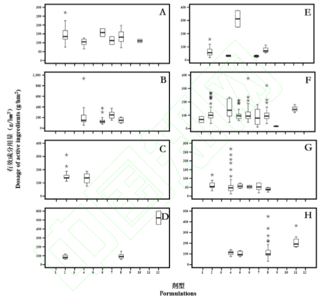 8种三唑类杀菌剂登记的主要剂型有12 种,其中推荐有效成分用量差异大、离群高值点较多的剂型分别为乳油、悬浮剂、水乳剂和可湿性粉剂,推荐有效成分用量差异大、离群高值点数较多的有效成分分别为戊唑醇、丙环唑和氟环唑(图2)。其中推荐有效成分用量 范围最大的为丙环唑乳油,为 56.25~936.00 g/hm2,其次为氟环唑悬浮剂,为 31.25~450.00 g/hm2,其余的还有戊唑醇水乳剂和丙环唑水乳剂,最高推荐有效成分用量为 375.00 g/hm2,最低推荐有效成分用量分别为 46.88 g/hm2和 75.00 g/hm2。此外,推荐有效成分用量较大的还包括粉唑醇颗粒剂,最大值为 600.00 g/hm2。