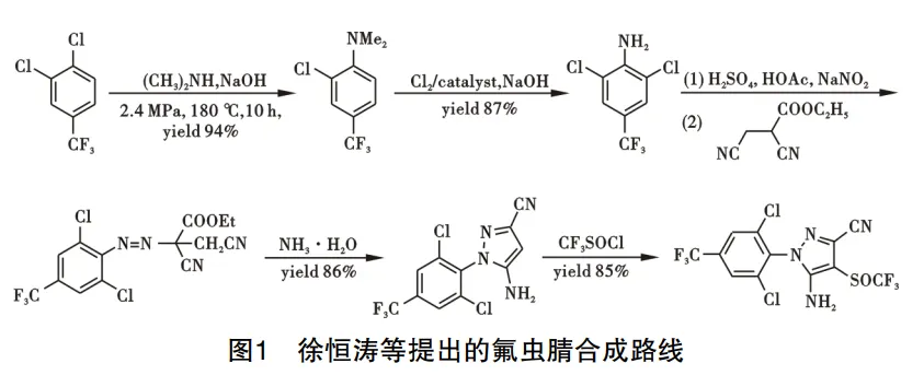 2017年,徐恒涛等提出一种制备氟虫腈的方法,以3,4-二氯三氟甲苯为起始原料,通过二甲胺、氯气与化合物母体发生亲核加成反应制备2,6-二氯-4-( 三氟甲基)苯胺。然后,以浓硫酸和亚硝酸钠为原料,在冰醋酸溶剂中反应生成亚硝酰硫酸,继而与芳胺进行重氮化反应生成芳胺重氮盐,再与二氰基丙酸酯进行缩合反应,然后在氨水中关环生成吡唑;最后以二甲胺为缚酸剂,用三氟甲基磺酰氯对制备的吡唑产物进行酰化反应得到氟虫腈。与先前的合成路线相比,该路线步骤更少,产品收率更高,路线见图1。