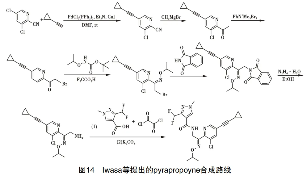 Pyrapropoyne是由日本日产化学工业株式会社开发的吡唑甲酰胺类杀菌剂,可用于防治由灰葡萄孢菌引起的园艺植物灰霉病以及草莓果腐病。Iwasa等提出pyrapropoyne的制备路线:以3,5-二氯吡啶腈、乙炔基环丙烷为中间体,三乙胺为缚酸剂,在碘化亚铜、三苯基膦氯化钯催化下发生偶联反应得3-氯-5-(环丙基炔基)吡啶腈;在格氏试剂参与下,由吡啶腈得到吡啶乙酮。然后通过溴代反应所得中间体进攻异丙氧基氨基甲酸叔丁酯,得到(Z)-1-(3-氯-5-(环丙基炔基)吡啶-1-酮氧异丙 基肟,然后与邻苯二甲酰胺反应得到(Z)-2-(2-(3-氯-5-(环丙基炔基)吡啶)-2-(异丙氧基亚胺基)乙基)异吲哚啉-1,3-二酮,在水合肼的还原下得到伯胺中间体,最后在草酰氯参与下与3-(二氟甲基)-1-甲基-1H-吡唑-4-羧酸 发生酰化反应,得到产品pyrapropoyne,路线见图14。
