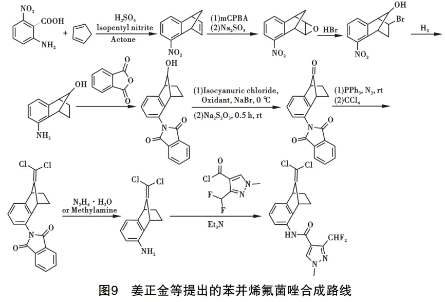 2017年姜正金等提出制备苯并烯氟菌唑的合成路 线,以2-氨基-6-硝基苯甲酸、1,3-环戊二烯为原料通过狄尔斯-阿尔德反应,得到5-硝基-1,4-二氢-1,4-桥亚甲基萘,在间氯过氧苯甲酸氧化下得到[2,3]-环氧-5-硝基-1,2,3,4-四氢-1,4-桥亚甲基萘,再通过氢溴酸溴代、氢气还原,得到5-氨基1,2,3,4-四氢-1,4-甲基萘-9-醇,接着与邻苯二甲酸酐反应得到2-(9-羟基-1,2,3,4-四氢-1,4-甲萘-5-基)异吲哚啉-1,3-二酮,然后羟基经氧化得羰基,在三苯基磷催化下进行氯代反应,然后在水合肼作用下去除保护基团,得到中间体9-(二氯甲烯基)-1,2,3,4-四氢-5-氨基萘,将其与3-(二氟甲基)-1-甲基-1H-吡唑-4-酰氯进行酰化反应,得到产物苯并烯氟菌胺,路线见图9。