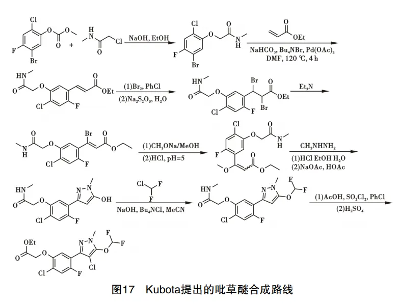 2017年,Kubota提出了吡草醚的合成路线,以5-溴-2-氯-4-氟苯基碳酸甲酯、1-氯丁-2-酮为原料,经过缩合、溴代、消除、水解、环化、成醚、酯化等反应,最终得到吡草醚,路线见图17。