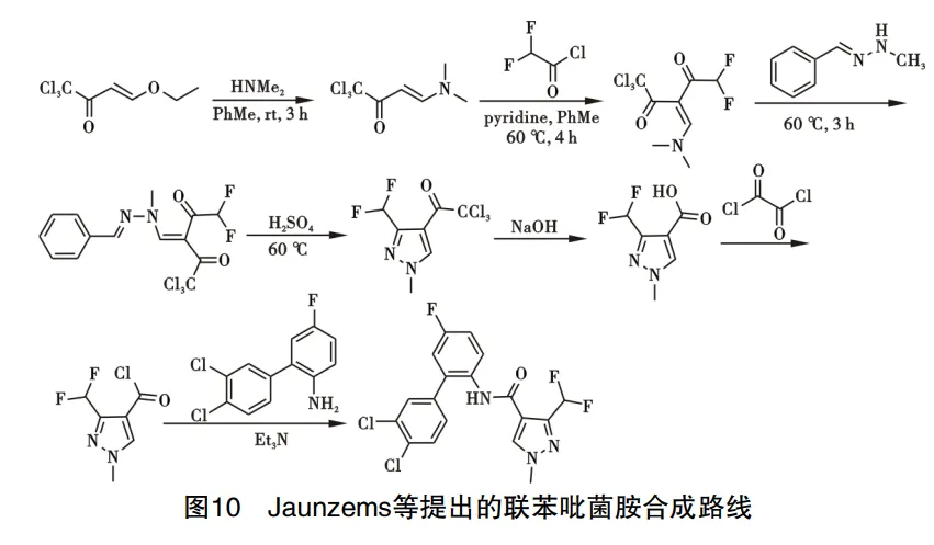 2019年,Jaunzems提出了联苯吡菌胺制备路线,以(E)-1,1,1-三氯-4-乙氧基3-丁烯-2-酮为起始原料,与二甲胺反应得到 (E)-1,1 ,1-三氯-4-(二甲基氨基)-3-烯-2-酮,所得烯胺在碱性条件下与2,2-二氟乙酰氯发生酰化反应,生成(Z)-1,1,1-三氯-3-((二甲氨基)亚甲基)-5,5-二氟戊烷-2,4-二酮再与(E)-1-亚苄基-2-甲基肼发生取代反应,之后在浓硫酸的作用下发生关环反应生成吡唑环产物,经水解、酰化反应得到联苯吡菌胺,路线见图10。2017年,Wassmann、Britton等提出联苯吡菌胺制备路线与氟唑环菌胺的制备路线相似,只有最后一步化反应所需的胺基中间体不同,在此不再赘述。