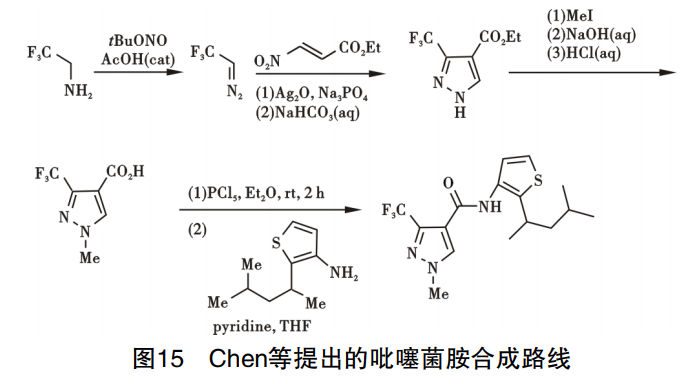 吡噻菌胺由日本三井化学公司所研发,作用于琥珀酸脱氢酶,通过影响致病菌线粒体呼吸链的电子传递,阻碍其能量代谢,抑制病原菌的生长,最终真菌死亡,从 而达到防治目的。吡噻菌胺对锈病、白粉病、菌核病、灰 霉病和苹果黑星病等均显示出很好的杀菌活性,杀菌谱广,且与其他杀菌剂无交互抗性。Chen等提出制备吡噻菌胺的路线:以三氟甲基乙胺和(E)-3-硝基丙烯酸乙酯为原料,通过关环反应得到重要中间体3-(三氟甲基)-1H-吡唑-4-羧酸乙酯,与碘甲烷反应得到甲基化中间体,再与2-(4-甲基戊烷基)噻吩-3-胺和五氯化磷在哌啶催化下进行酰化反应得到吡噻菌胺,路线见图15。