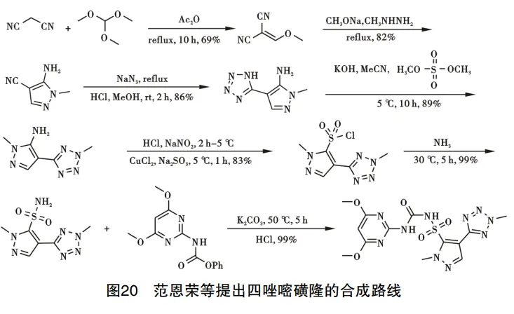2016年,范恩荣等提出制备四唑嘧磺隆路线,以丙二腈、原甲酸三甲酯为起始原料,经过缩合反应得到2-(甲氧基亚甲基)丙二腈,再与甲基肼在乙醇钠的作用下关环得到5-氨基-1-甲基-1H-吡唑-4-腈,与叠氮化钠发生[3+2]环加成反应得到1-甲基-5-氨基-4-(四氮唑-5-基)吡唑,然后在缚酸剂存在下,与硫酸二甲酯反应得到2-甲基-5-(1-甲基-5-氨基-1H-吡唑-4-基)-2H-四氮唑;再经过重氮化后,与亚硫酸钠、氯化铜、乙酸混合物反应得到磺酰氯,然后通氨气反应得到磺酰胺,最后与2-苯氧羰基氨基-4,6-二甲氧基嘧啶反应得到目标产 物四唑嘧磺隆,路线见图20。