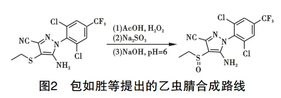 包如胜等提出了乙虫腈新合成路线,以5-氨基-3-氰基-1-(2,6-二氯-4-三氟甲基苯基)-4-乙基亚硫酰基吡唑为原料,在乙酸、双氧水参与下发生氧化反应,再以氢氧化钠溶液调整体系酸碱度;升温回流后,再冷却结晶抽滤得到乙虫腈,路线见图2。