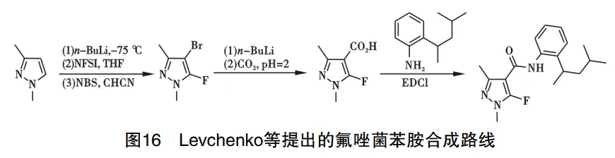 氟唑菌苯胺主要用于种子处理,对多种植物病原真菌具有良好活性。2018年,Levchenko等提出氟唑菌苯胺的制备路线,以1,3-二甲基吡唑为初始原料,经溴代得4-溴-5-氟-1,3-二甲基-1H-吡唑,在二氧化碳和丁基锂的参与下得到5-氟-1,3-二甲基-1H-吡唑-4-羧酸,最终与2-(2,3-二甲基丁基)苯胺经酰化反应得到氟唑菌苯胺,路线见图16。