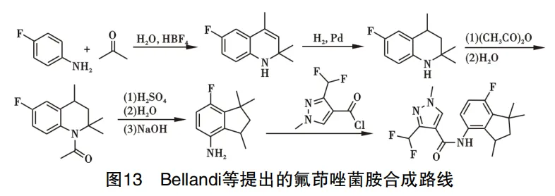 Fluindapyr是由意赛格公司和美国富美实公司联合开发的吡唑甲酰胺类杀菌剂。可用于大豆、谷物、甘蔗等多种作物,而且对作物具有增产的效果。Bellandi等提出氟茚唑菌胺制备路线,以对氟苯胺为起始原料,在氟 硼酸作用下与丙酮发生环化反应,得到产物6-氟-2,2,4-三甲基-1,2-二氢喹啉,所得产物通过催化氢化还原为6-氟-2,2,4-三甲基-1,2,3,4-四氢喹啉,还原产物中的亚氨基与醋酸酐发生酰化反应,生成1-(6-氟-2,2,4-三甲基-3,4-二氢喹啉)乙酮,该产物在硫酸催化下发生重排反应,通过氢氧化钠调节pH值,得到中间体游离胺,所得游离胺与3-(二氟甲基)-1-甲基-1H-吡唑-4-酰氯发生酰化反应,得到产品氟茚唑菌胺,路线见图13。